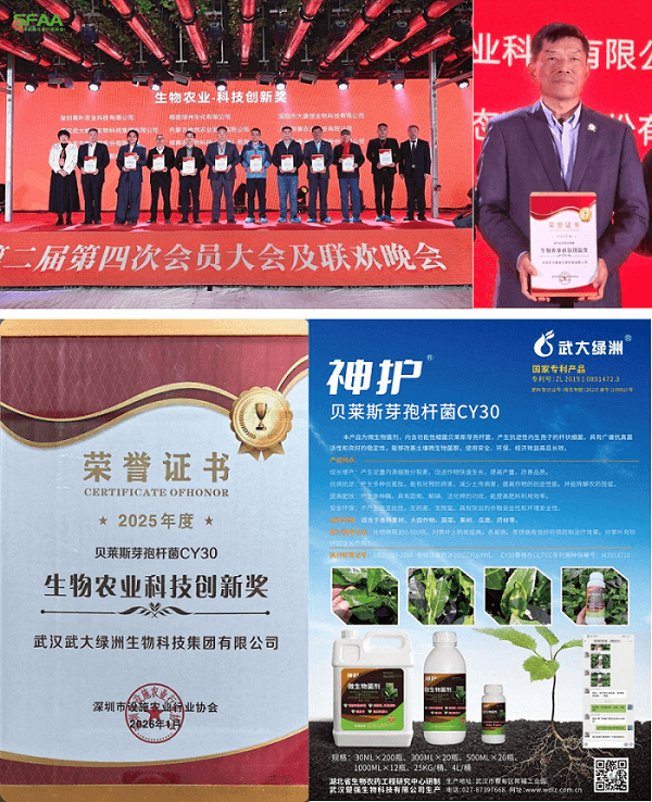 晚会现场同步开展会员企业授牌、农业科技创新奖颁发及协会年度最佳贡献者表彰活动,以表彰先进、凝聚行业发展合力。武大绿洲集团专利产品贝莱斯芽孢杆菌CY30经过评审荣获“2025年度生物农业科技创新奖”。